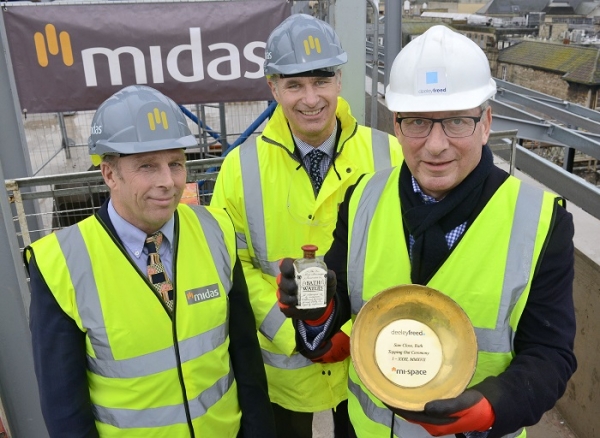 Image: Councillor Tim Warren, Rob Bradley (Mi-space) and David Freed mark the topping out stage of construction at Saw Close, Bath.