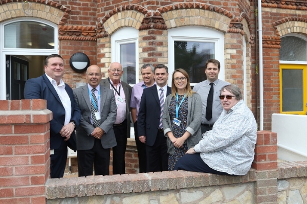 Image: left to right: Tim Baker, Mi-space, John Golding Strategic Lead – Housing & Environment EDDC, EDDC Cllr Bill Nash, Graham Baker Programme Works Officer EDDC, Paul Lowe Housing Enabling & Allocations Manager EDDC, Amy Gilbert Property and Asset Manager EDDC, Andrew Mitchell Housing Needs & Strategy Manager EDDC, EDDC Cllr Jill Elson & portfolio holder for sustainable homes and communities, standing outside 102 St Andrews Road, Exmouth.
